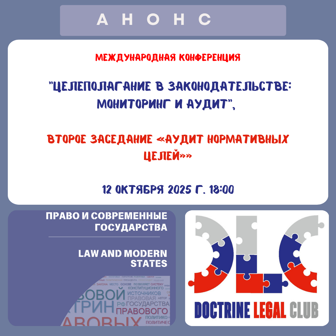 Уважаемые коллегии, приглашаем Вас на Международную конференцию "ЦЕЛЕПОЛАГАНИЕ В ЗАКОНОДАТЕЛЬСТВЕ: МОНИТОРИНГ И АУДИТ", второе заседание «АУДИТ НОРМАТИВНЫХ ЦЕЛЕЙ». Время: 18 часов 12 октября 2025 года Место: online. ZOOM: Подключиться к конференции Zoom