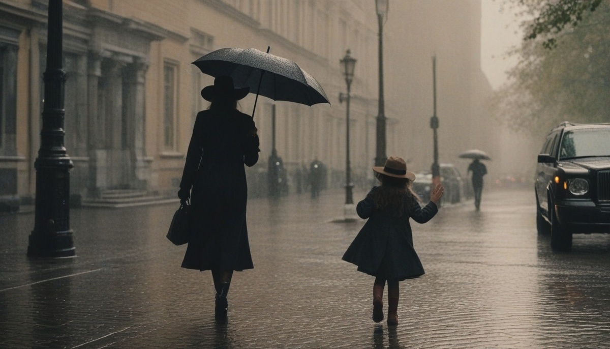 Осенний дождь барабанил по крышам, словно назойливый барабанщик, требуя внимания к своему концерту. Город утопал в серой дымке, и лишь редкие огни фонарей пробивались сквозь пелену моросящего дождя. Я, вооружившись своей новой широкополой шляпой и элегантным черным зонтом-тростью, чувствовала себя героиней старого фильма.