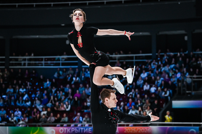 Анастасия МУХОРТОВА / Дмитрий ЕВГЕНЬЕВ. Александр Смирнов нам разъяснил, что Настя и Дима активно учат старшие выбросы, именно поэтому в этом сезоне пошли ошибки на элементах. Ничего не имею против движения вперед и освоения того, что раньше ты не умел. И, наверное, именно в начале сезоне как раз то время, когда нужно пробовать, ошибаться, вносить корректировки. Пока что мы видим стабильную ошибку на выбросе у пары. Самое главное, чтобы она не потянула за собой и другие срывы. Если честно, я все же не уверена, что плюс один балл к базовой оценке на данном этапе так уж ребятам необходим. Они вполне могли развиваться именно в сторону программ, образов и взаимодействия в паре. Просто именно в этом сезоне вышло много юниоров, которые тоже хотят застолбить себе место, а тут у нас пара, которая с некой периодичностью допускает ошибки. Главное чтобы не получилось так, что в погоне за большей базой, ребята потеряют свои позиции.