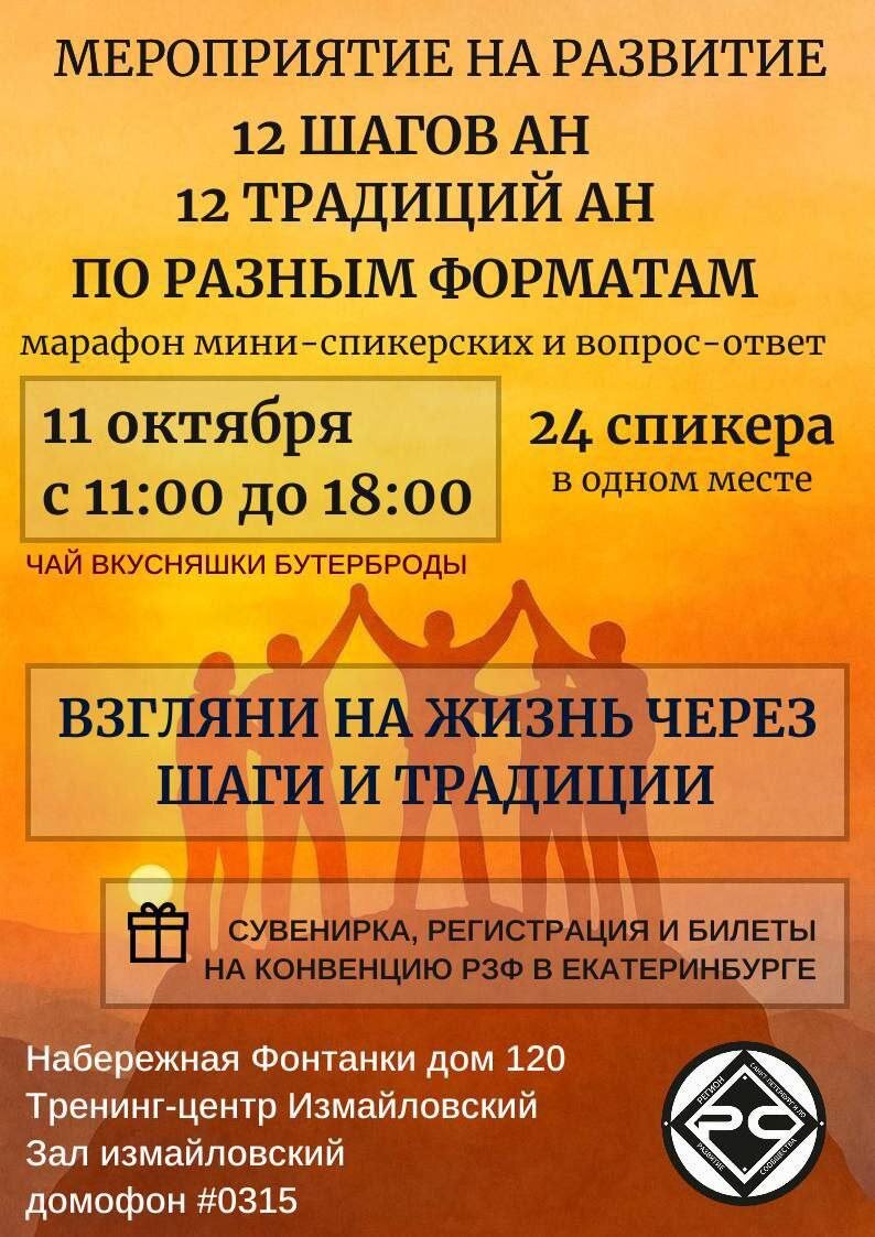 Уже завтра! В эту субботу! Грандиозный марафон выздоровления в Санкт-Петербурге! Друзья, выздоравливающие и все, кому небезразлична тема преодоления зависимости! Приглашаем вас завтра на большое открытое мероприятие сообщества «Анонимные Наркоманы» в Санкт-Петербурге. Мы полностью погрузимся в сердце нашей программы — 12 Шагов и 12 Традиций. В программе дня: 🎤 Марафон мини-спикерских: 24 УНИКАЛЬНЫХ истории силы и надежды! Мы специально делаем акцент на том, что вы услышите самых разных спикеров с самым разным опытом выздоровления! ✅ Разный стаж — от тех, кто только недавно обрел чистоту, до тех, кто идет этим путем долгие годы. ✅ Разный возраст и жизненные обстоятельства. ✅ Разные форматы работы по Шагам и Традициям. Каждый спикер будет освещать один из 12 Шагов или одну из 12 Традиций через призму своей личной истории. Это гарантирует, что каждый найдет своего спикера, чья история отзовется именно в его сердце. Для кого это мероприятие? ✅ Для новичков: Услышите, что вы не один