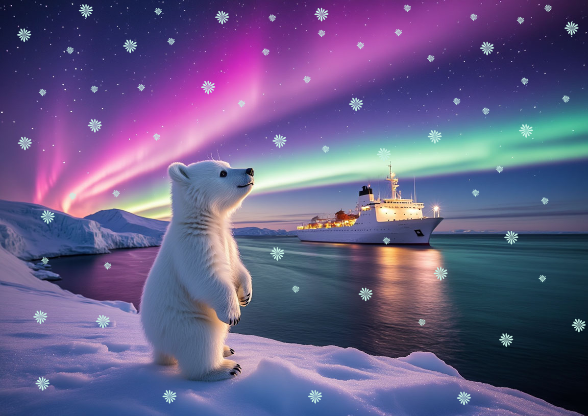В далёкой-далёкой северной стране, где снег лежит почти круглый год, а солнце зимой совсем не показывается, жил-был маленький белый медвежонок по имени Лапик. Он был самым любознательным медвежонком во всём заполярном краю. Каждый день Лапик исследовал окрестности своего ледяного края. Он любил наблюдать за северным сиянием, которое раскрашивало небо в разноцветные узоры, и слушать, как ветер поёт свою особенную песню среди ледяных торосов, а мимо проходят красавцы ледоколы. Однажды, гуляя по заснеженной тундре, Лапик заметил странное сияние у подножия ледяной горы. Любопытный медвежонок отправился на разведку и обнаружил там удивительное место — целую пещеру, стены которой были украшены сверкающими кристаллами льда. В глубине пещеры Лапик увидел старого полярного волка, который что-то тихо напевал.