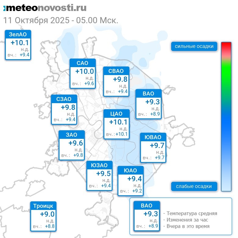 В 5:00 в Москве было от +9°C до +10.3°C, средняя температура +9.7°C #погода #Москва #осень #температура #11октября #суббота Перейти на сайт Прогноз погоды на 14 дней