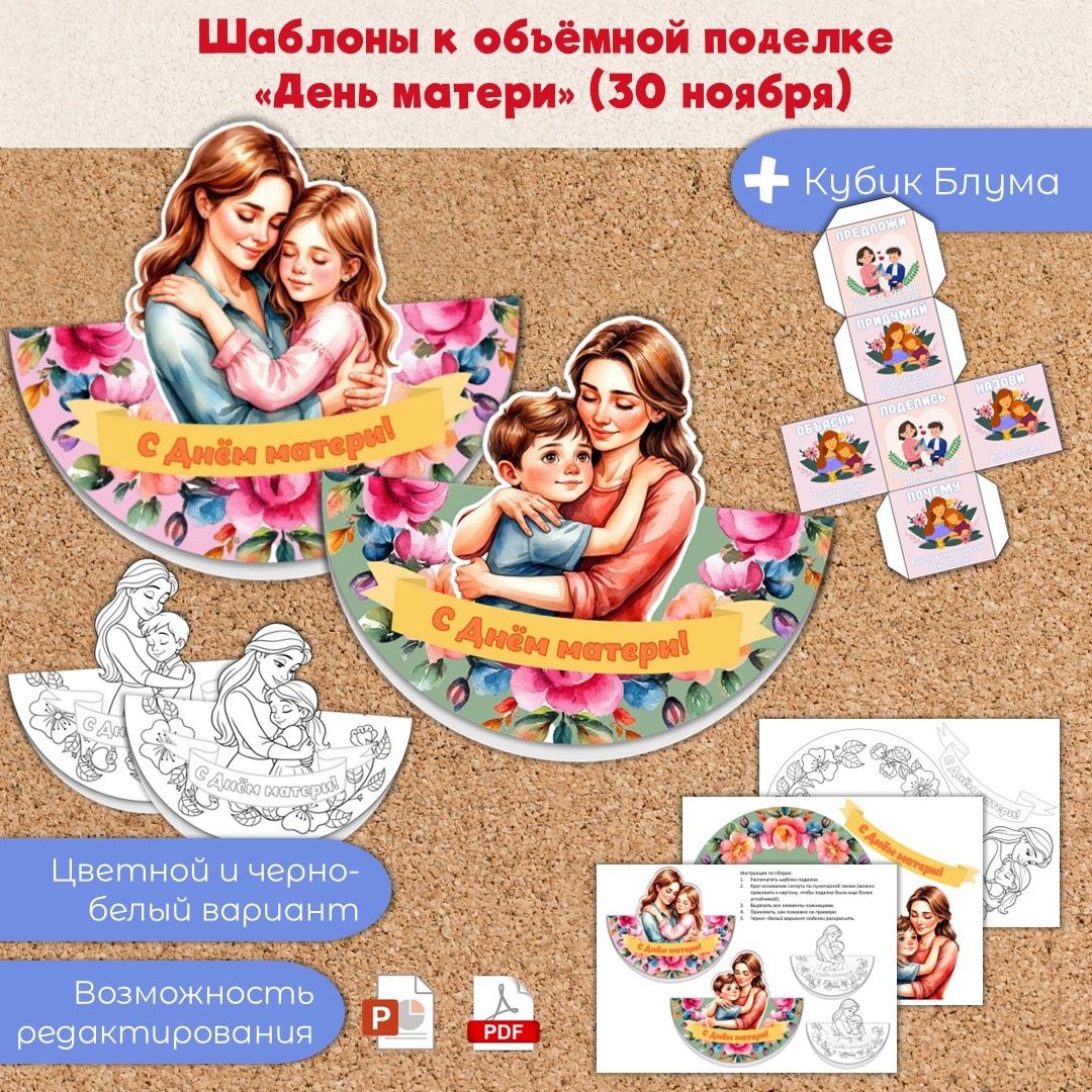 Шаблон к объемной поделке «День матери» (30 ноября). Материал содержит шаблоны для изготовления поделок и инструкцию по их изготовлению. Подходит для проведения воспитательных мероприятий, тематических и внеурочных занятий, направленных на выражение признательности и уважения к матерям, а также на осознание значимости семейных ценностей. В комплект входит: Какие идеи и темы можно реализовать с помощью данного комплекта материалов: Файл в формате PDF и PPTX. Есть возможность редактирования. Каждая деталь в формате png. Можно менять размеры всех деталей.