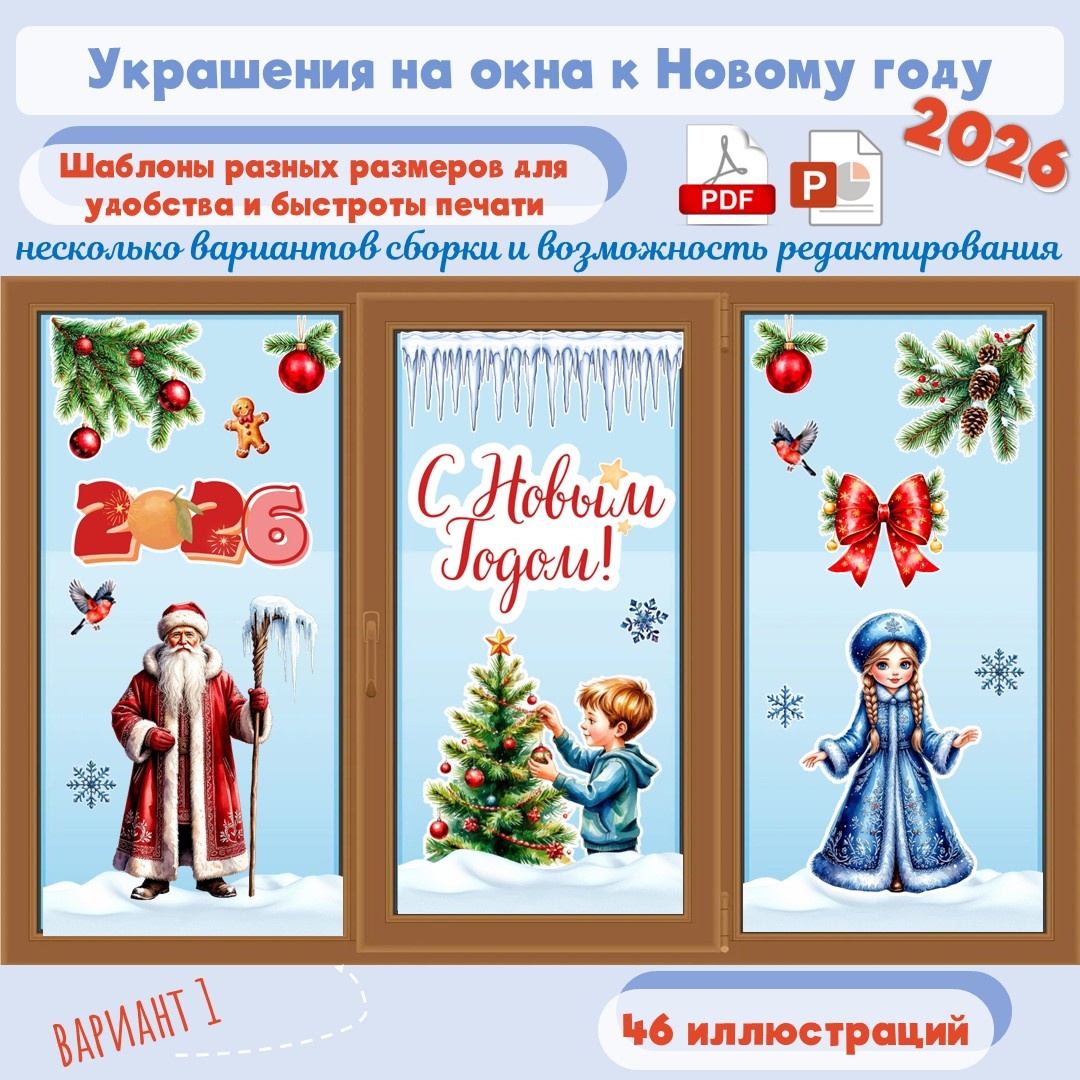 Украшение окон (кабинета, школьной доски) к Новому году. Подходит для новогоднего оформления окон в школах, детских садах, квартирах. Шаблоны универсальные. Для примера представлено три варианта украшения окон. Однако вы самостоятельно сможете придумать свою композицию на окне, так как материал содержит достаточное количество различных иллюстраций для реализации любых идей. В набор для оформления входит более 40 иллюстраций: лошади - символы 2026 года, новогодние шары, снежинки, снегири, снеговик, ёлки, месяц, звезды, ёлочные ветки, сосульки, сугробы, домик, шарики, снегурочки, Деды Морозы, коробки с подарками, новогодние венки, бант, надписи "С Новым Годом!" и "2026". Шаблоны представлены в формате А4, а также многие элементы продублированы на двух листах А4 для удобства и быстроты печати. Файл в формате PDF и PPTX. Есть возможность редактирования.