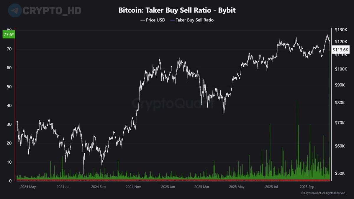 🤯 CryptoQuant: Быки на Bybit идут ва-банк и массово залетают в лонги – объем сделок на покупку почти в 78 раз превышает продажи (Taker Buy/Sell Ratio).