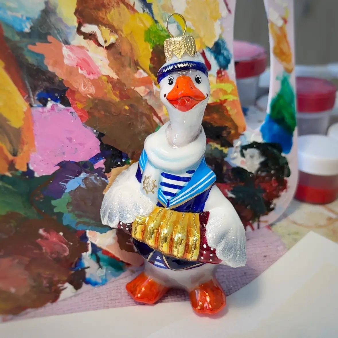Детали фигуры особенно красиво смотрятся в движении, создавая эффект настоящей праздничной сказки. Гусь-морячок с баяном — это не просто украшение: Сделайте фото вашего Гуся-морячка с баяном и делитесь в комментариях! #Ариель #ГусьМорячок #стеклянныеигрушки #ручнаяработа #новыйгод #праздник #коллекционирование #елочнаяигрушка