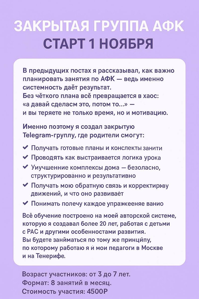 🔒 Набор в закрытую Telegram-группу по нейросенсорной АФК! 🔒 В предыдущих постах я рассказывал, как важно планировать занятия по АФК — ведь именно системность даёт результат. Без чёткого плана всё превращается в хаос: «а давай сделаем это, потом то…» — и вы теряете не только время, но и мотивацию. 📘 Именно поэтому я создал закрытую Telegram-группу, где родители смогут: ✅ получать готовые планы и конспекты занятий, составленные лично мной; ✅ видеть, как выстраивается логика урока для ребёнка с РАС; ✅ выполнять комплексы дома — безопасно, структурировано и результативно; ✅ получать мою обратную связь и корректировку движений; ✅ понимать, почему каждое упражнение важно и что оно развивает. 💬 Всё обучение построено на моей авторской системе, которую я создавал более 20 лет, работая с детьми с РАС и другими особенностями развития. Вы будете заниматься по тому же принципу, по которому работаю я и мои педагоги в Москве и на Тенерифе. ⸻ 👶 Возраст участников: от 3 до 7 лет. 📅 Формат: