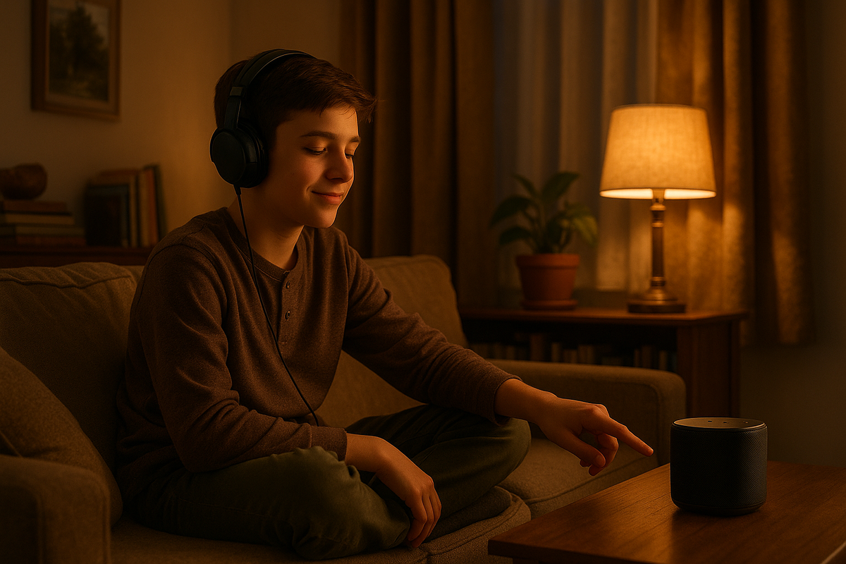 Я даже не знал, что она это умеет. Сын поднял голову, немного удивлённо взглянув на колонку. Она не сказала ни слова, но музыка продолжала звучать, подстраиваясь под его поведение. В комнате стало теплее, как будто сама атмосфера изменилась. Через пару минут его лицо стало мягче. Он вздохнул и сказал: “Просто трудный день был.”