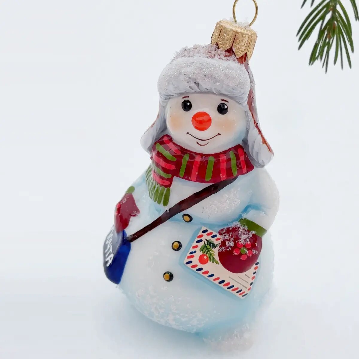 Этот Снеговик-почтальон — настоящая зимняя сказка в стекле: с аккуратной сумкой и письмом, он символизирует добро, тепло и новогодние чудеса. Каждая игрушка Ариель — это маленькая история, оживающая на празднике.