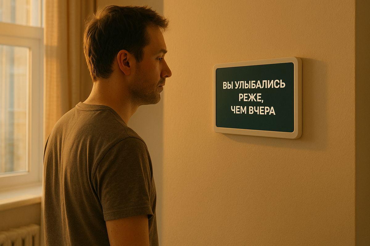 Я сел на стул и долго смотрел на этот отчёт. Не потому что обидно, а потому что было странное ощущение — как будто кто-то видит меня лучше, чем я сам. Днём я попробовал улыбнуться специально — проверить, как реагирует система. Через пару секунд панель мигнула и сообщила: «Настроение улучшается. Продол