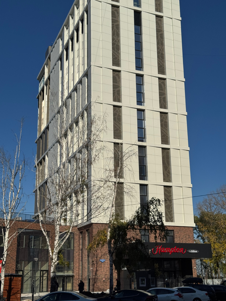 На уже построенных фасадах комплекса уже появилось фирменное оформление с надписью Hampton by Hilton .