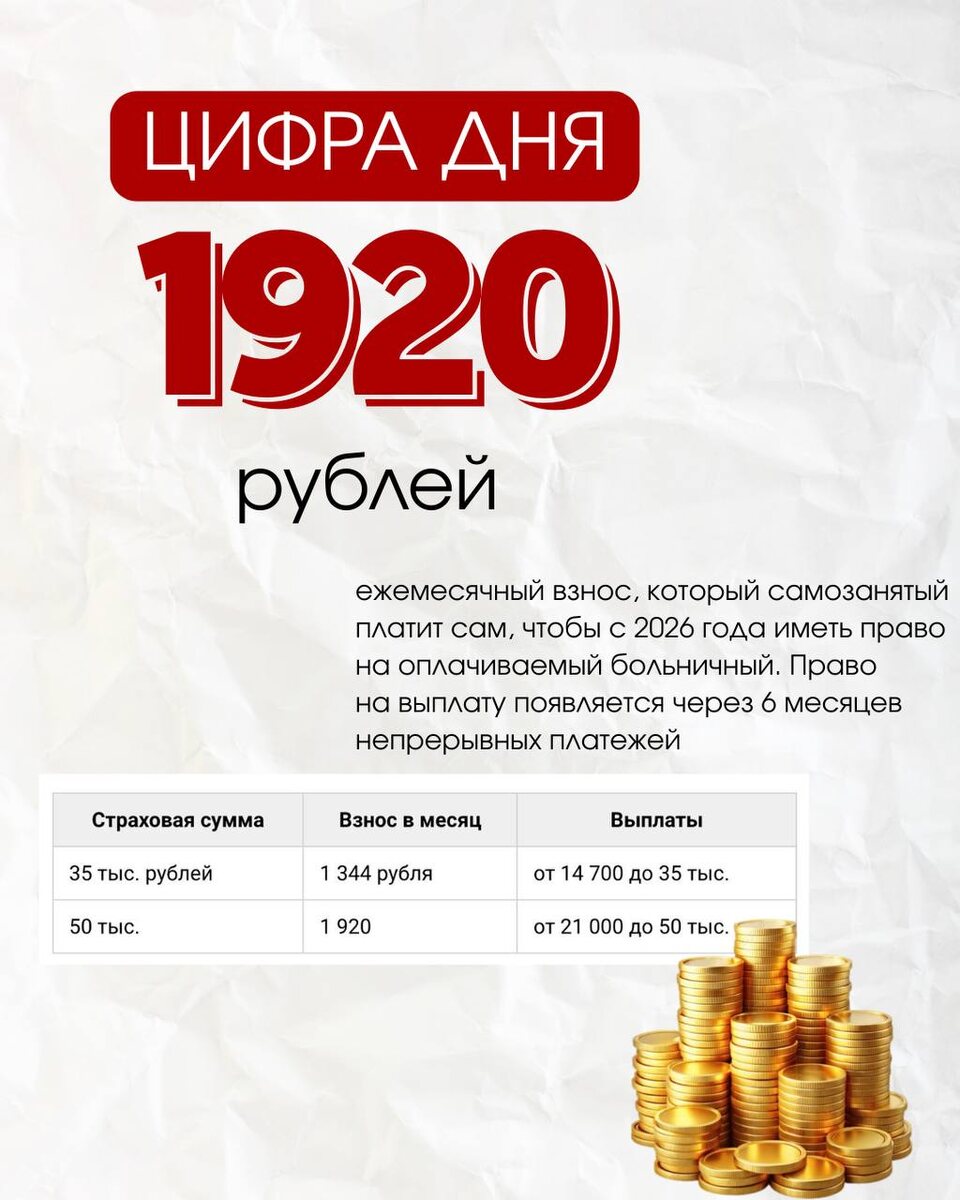 Внесён законопроект: с 2026 года самозанятые смогут получать больничные по взносам 9️⃣ октября Правительство внесло в Госдуму проект федерального закона об эксперименте 2026–2028 годов: самозанятые (НПД) смогут добровольно застраховаться в СФР и получать пособие по временной нетрудоспособности. Это не автоматически, а по заявлению и при регулярной уплате взносов. Как это работает, по-простому: Кто платит: самозанятый, ежемесячно, по собственному желанию. Сколько платить: выбирается страховая сумма — 35 000 ₽ или 50 000 ₽; соответствующий взнос — 1 344 ₽/мес. или 1 920 ₽/мес. Когда возникает право на пособие: через 6 месяцев непрерывных платежей. Если платите больше 12 месяцев, размер пособия за месяц болезни — 100% выбранной страховой суммы; при стаже 6–12 месяцев — 70%. Сколько это в деньгах: при сумме 35 000 ₽ — от 24 500 до 35 000 ₽ за полный месяц нетрудоспособности; при сумме 50 000 ₽ — от 35 000 до 50 000 ₽. Сроки: подать заявление можно до 30 сентября 2027 года; эксперимент пл