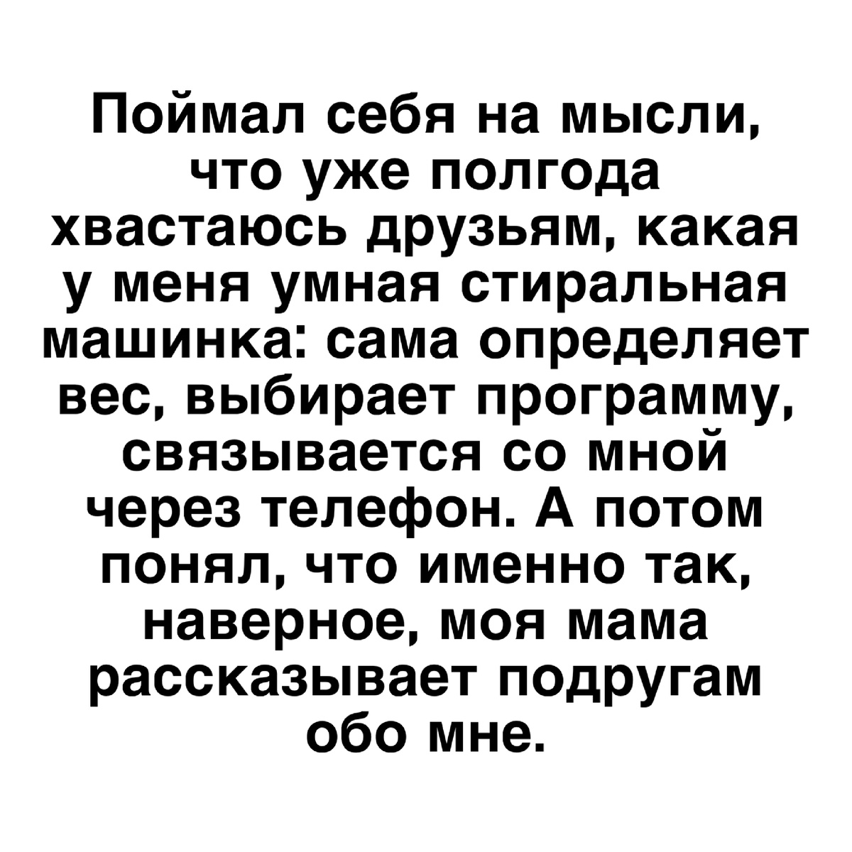 1. Звонок в техподдержку — У вас клавиатура беспроводная? — Да. — А где у нее разъем для кабеля? — Он сбоку. — А он только один? — Да. — Странно... А как тогда вставлять флешку? 2. Мамина радость Поймал себя на мысли, что уже полгода хвастаюсь друзьям, какая у меня умная стиральная машинка: сама определяет вес, выбирает программу, связывается со мной через телефон. А потом понял, что именно так, наверное, моя мама рассказывает подругам обо мне. 3. Логика айтишника Наш сисадмин, получая новый паспорт в миграционной службе, обнаружил, что в графе «Пол» стоит прочерк. Его первая реакция была: «О, наконец-то NULL вместо пустой строки!» 4. Случай в маршрутке В маршрутке водила такой бородатый, суровый, на вид лет 45. Вдруг у него телефон зазвонил. На всю маршрутку играет рингтон: «Пусть бегут неуклюже пешеходы по лужам...» Он берет трубку и таким густым басом говорит: «Алло, зайка!» 5. Диалог с ребенком — Пап, а Дед Мороз настоящий? — Нет, сынок. — А Санта?