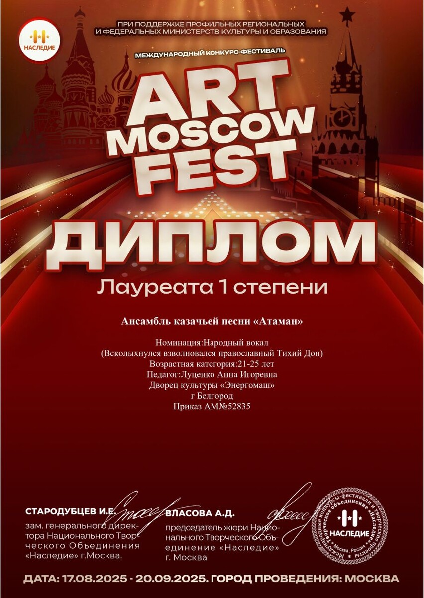 Ансамбль казачьей песни «Атаман» Дворца культуры «Энергомаш» трижды лауреат 1-й степени международного конкурса-фестиваля «ART MOSCOW FEST». Этот успех подчеркивает высокий уровень мастерства и уникальность репертуара ансамбля.