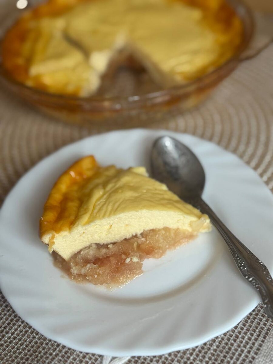 Пока у нас сезон яблок, пользуемся моментом и получаем не просто удовольствие, но и пользу. Делюсь с вами рецептом творожно-яблочного десерта 😋 Готовится очень просто и быстро. Все как мы любим 😉 Ингредиенты: ▪️2 больших яблока или 3-4 маленьких ▪️10-15 гр сливочного масла Корица - по вкусу ▪️200 гр творога (у меня 9%) ▪️3 яйца ➡️Яблоки нарезать кубиками. Если яблоки покупные, снимаем с них шкурку. У меня домашние, я не чистила их. На сковороду кладем сливочное масло, к нему порезанные яблоки. Посыпать корицей по вкусу. Тушим яблоки примерно 5 минут. Пока яблоки готовятся, творог и яйца переложить в чашу блендера, взбить до однородности. Готовые яблоки перекладываем в форму для запекания, сверху заливаем яично-творожной смесью. Выпекать в духовке при 180 градусах 30 минут. ✔️Если у вас яблоки не очень сладкие, добавьте немного сахара. Я не добавляла ни в яблоки, ни в творог. Десерт получается очень нежный и ароматный🥰 И как видите, очень простой. Если будете готовить, делитес