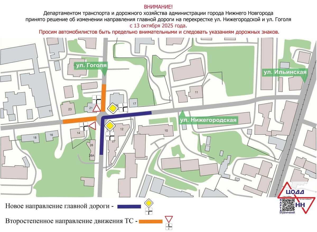 В обратном направлении — при повороте направо с улицы Гоголя на улицу Нижегородскую — также изменится приоритет. Ранее главная дорога проходила по улице Гоголя в прямом направлении.