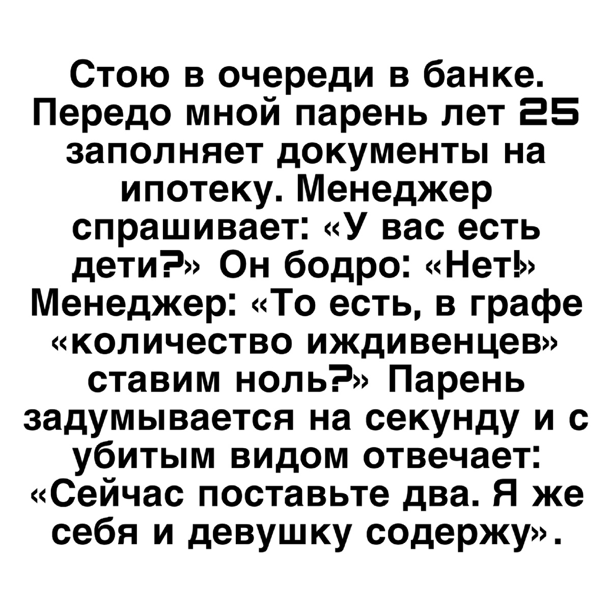 1. Забота о будущем Стою в очереди в банке. Передо мной парень лет 25 заполняет документы на ипотеку. Менеджер спрашивает: «У вас есть дети?» Он бодро: «Нет!» Менеджер: «То есть, в графе «количество иждивенцев» ставим ноль?» Парень задумывается на секунду и с убитым видом отвечает: «Сейчас поставьте два. Я же себя и девушку содержу». 2. Неожиданная реакция Мой кот умудрился запрыгнуть на холодильник и сбросить оттуда банку с гречкой. Та с грохотом разбилась, крупа летела во все стороны. Я застыл в ступоре, ожидая победного кошачьего «мяу». Вместо этого кот с ужасом в глазах посмотрел на меня и спрятался под диван. Видимо, думал, что это я устроил апокалипсис. 3. Служебный роман Наш офисный айтишник, симпатичный парень, получил в службе поддержки запрос: «Не работает мышка». Пришел, пощелкал — все работает. Девушка-менеджер краснеет и говорит: «А я думала, она беспроводная, и просто трясла ее в воздухе...» Через год они поженились. Говорит, покорила ее наивность. 4. Логика стро