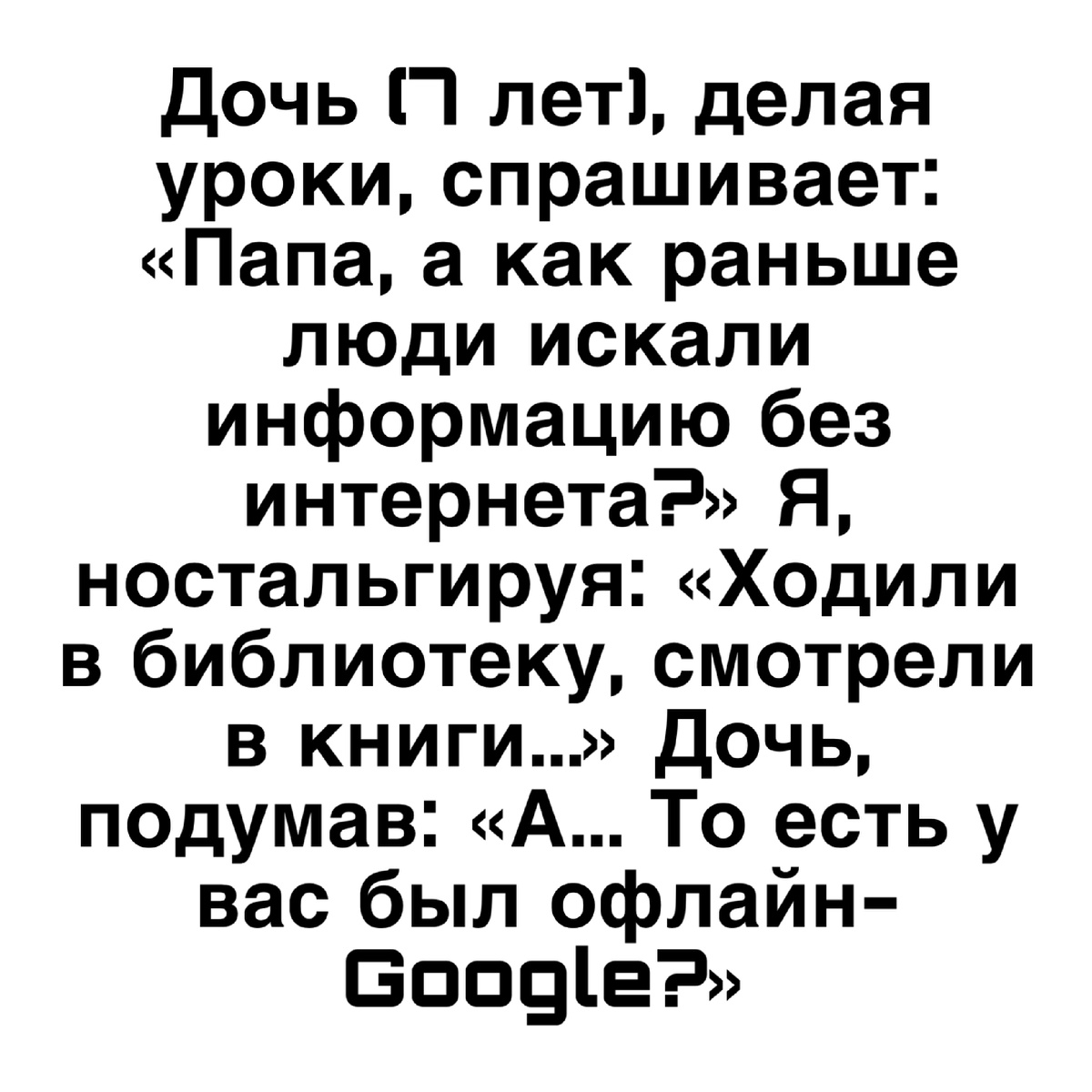 1. Новая реальность Дочь (7 лет), делая уроки, спрашивает: «Папа, а как раньше люди искали информацию без интернета?» Я, ностальгируя: «Ходили в библиотеку, смотрели в книги...» Дочь, подумав: «А... То есть у вас был офлайн-Google?» 2. Такси до прозрения Еду в такси. Водитель все пути рассказывал, как мечтает бросить работу и уехать на Бали. Подъезжаем к дому, он выключает счетчик и говорит: «Ну все, на Бали сходил. С вас 420 рублей». 3. Офисный хомяк Наш самый тихий и скромный программист вдруг начал дико хохотать в своём углу. Оказалось, он два часа искал баг в коде, а потом заметил, что его кружка стоит на клавиатуре и буква «G» была постоянно зажата. 4. Лавка философов Стою в очереди в пекарне. Передо мной бабушка покупает один батон. Продавец ей: «Мария Ивановна, а вам как всегда половинку отрезать?» Бабушка: «Нет, сегодня целый. Настроение хорошее, проживу ещё денёк». 5. Мужская логика Муж починил дверцу шкафа, которая годами скрипела. Весь вечер ходил и открывал-зак