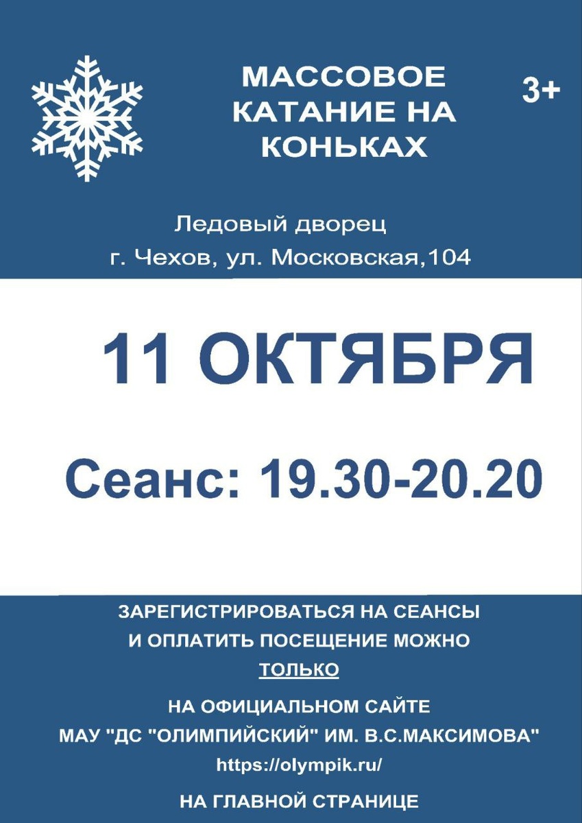 ✨ МАССОВОЕ КАТАНИЕ на льду в Ледовом дворце 👉Сеанс: 19:30-20:20 🎵 К вашим услугам качественный лед, хорошая музыка, прокат и заточка коньков. ℹ️ Размеры коньков: с 27 по 46. 💵 Стоимость проката: детские 200 руб., взрослые 300 руб. 🚫 Возраст: 3+ 📆 11.10.2025 🏢 Ледовый дворец спорта «Витязь» 📍 г. Чехов, ул. Московская, д.104 💰 Цена от: 140 до 280 ₽ 🔗 Купить билет: https://clck.ru/3NsBk2 ⭐Поддержать канал голосом ✅ Мероприятия Чехов https://dzen.ru/id/66cc4b48e9ef144699238a51 http://vk.com/chekhov_events http://dzen.ru/chekhov_events