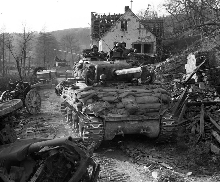 Здравствуйте Уважаемые читатели! В конце войны для противодействия фаустпатронам на наши танки крепили специальные экраны из сеток или тонкого листа жести. Часто считается, что они не спасали, хотя были и положительные отзывы о данном решении и, наверное, в каждом случае есть свои нюансы, вообще как и всегда. Американские танкисты фаустпатрон боялись, как минимум не меньше наших, и у них были свои методы противостояния им, а так же орудийным снарядам. Тем более в Нормандии в 1944 году американские танки уступали немецким и машин, подобным нашим ИС-2, серии самоход ИСУ и Т-34-85 у них не было, поэтому в полевых условиях старались повысить выживаемость основного танка М4 Шерман. Простейшим способом стало обвешивание танка мешками с песком. Порой под эти нужды наваривали специальные фермы. И да, в каких-то случаях это спасало, кумулятивная струя могла сменить направление, уйдя вкось, не пробив броню. Так же танки американцы заливали бетоном. Но был у данного бронирования жирный минус: это