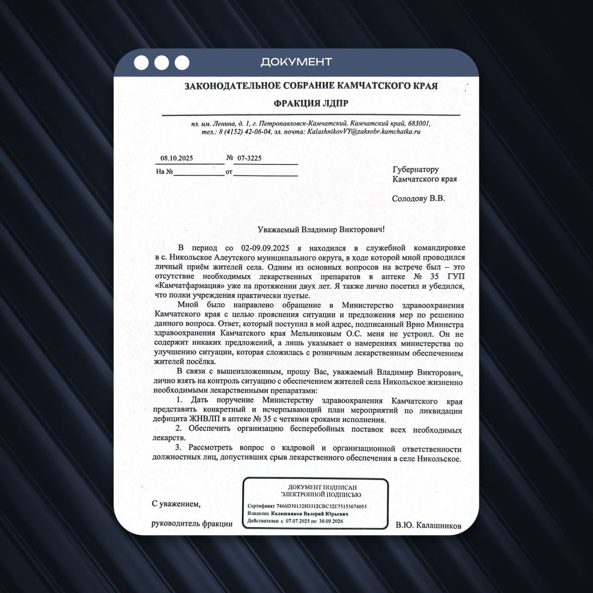ЛДПР следит за ситуацией с лекарственным обеспечением в селе Никольское Координатор регионального отделения ЛДПР, депутат Законодательного собрания Камчатского края Валерий Калашников обратился к губернатору Владимиру Солодову с просьбой наладить лекарственное обеспечение в Никольском. Во время командировки в отдалённый населённый пункт Валерий Калашников лично убедился в плачевной ситуации, которая сложилась сегодня в местных аптеках. Люди не могут приобрести жизненно важные препараты, да и выбраться с острова, порой бывает, очень сложно. Это ставит под удар не только здоровье, но уже и жизнь местных жителей. Первое обращение в адрес врио министра здравоохранения Мельникова не принесло результатов. ЛДПР будет отстаивать право людей на наличие лекарств в аптеках, даже в самых удалённых уголках. #ЛДПР #лекарства #обращение #медицина #здоровье