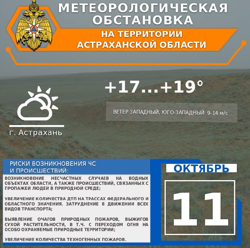 🍁Метеорологическая обстановка на 11 октября ⛅️На территории области облачно с прояснениями. 🌧Небольшие и умеренные дожди. 🌬Ветер западный, юго-западный 9-14 м/с. 🌡Температура воздуха днем +15...+20°, ночью +5...+10° ⛅️По г. Астрахань облачно с прояснениями. Без существенных осадков. 🌬Ветер западный, юго-западный 9-14 м/с. 🌡Температура воздуха днем +17...+19°, ночью +7...+9°. ✅Присоединяйся к МЧС Астрахань 👉🏼Подписывайся на МЧС России в Telegram | MAX