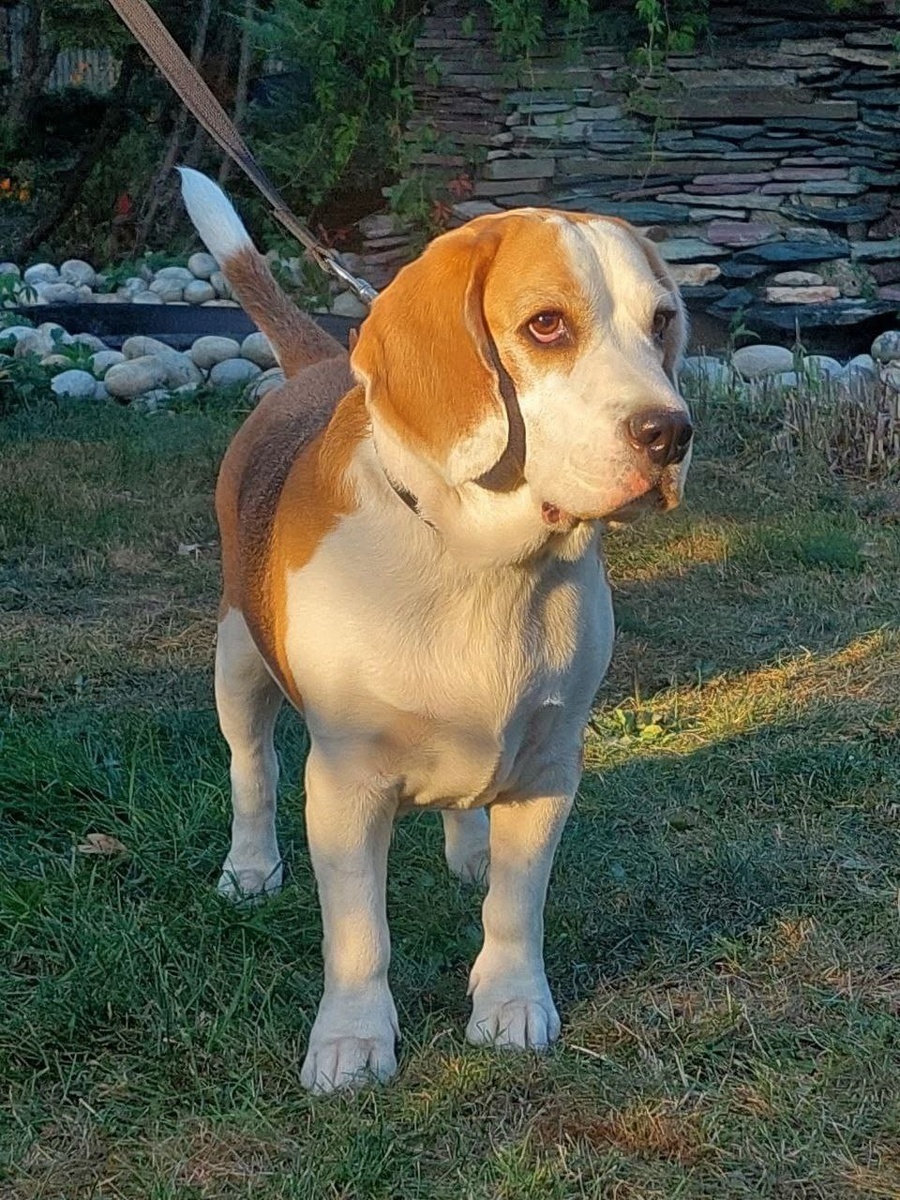 Саймон - крупный, упитанный бигль, спокойный и уравновешенный. Дома ведет себя цивилизованно, предпочитает повалять на чем ни будь мягеньком рядом с хозяином. Очень любит поесть, поэтому Саймону нужны активные прогулки, от которых он, кстати, не откажется, а с удовольствием составит вам компанию