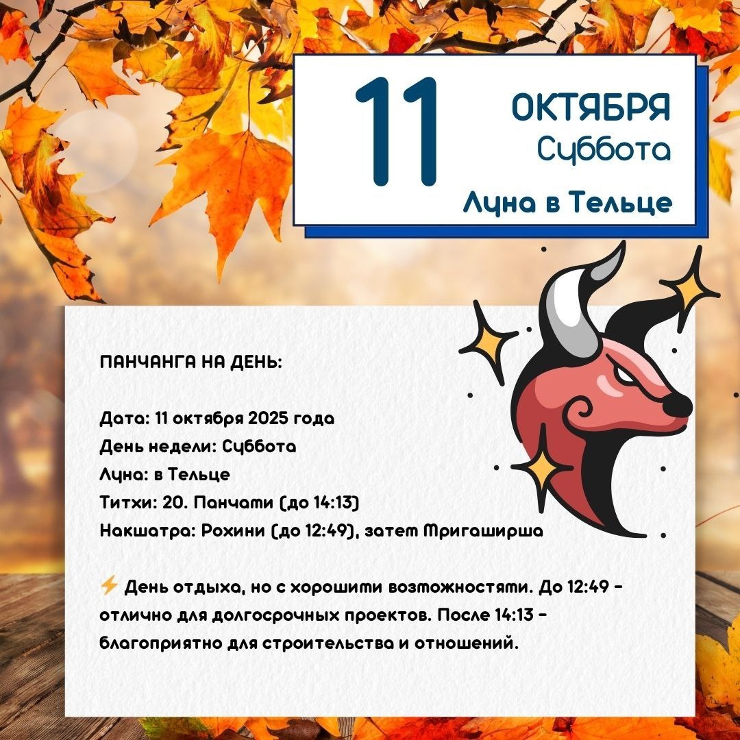 🪷 Астродайджест на субботу, 11 октября 🪐 День Сатурна Главная тема дня: Алхимия противоречий, где могущественная поддержка побеждает формальные ограничения. 💫 Ключевой аспект: Оппозиция Сатурн – Венера Сатурн в Рыбах строго смотрит на Венеру в Деве. Это испытание на прочность в сферах отношений, финансов и удовольствий. ⚪ Что проявится: Холодность там, где ждете тепла; чувство долга, которое противоречит желаниям; необходимость пересмотреть траты и эстетику с точки зрения практичности и долговечности. ⚪ Задача дня: Найти баланс. Проявить любовь через заботу и конкретные дела. Превратить ограничение (Сатурн) в прочный фундамент для будущей гармонии (Венера). 🌙 Лунные ритмы и Накшатры ⚪До 14:13 (Мск): 20-е лунные сутки (символ — «Орел»). Взгляд с высоты на свою жизнь. Идеально для медицины, лечения, позитивных действий. ⚪После 14:13: Начало 21-х лунных суток. Смена Накшатр в 12:50: ⚪До 12:50 — Рохини (Луна). Энергия роста, плодородия и стабильности. ⚪Благоприятно: Начало долг