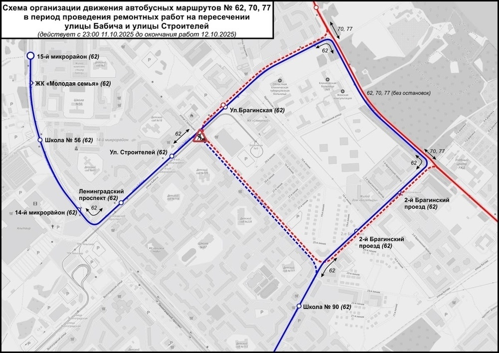 Из-за ремонта трамвайных путей. О временных изменениях в движении автобусов рассказали в министерстве дорожного хозяйства и транспорта Ярославской области. Автобусный график поменяется из-за работ на трамвайном переезде, расположенном на пересечении улиц Бабича и Строителей. Общественный транспорт будет ходить по-другому с 23:00 11 октября до окончания работ 12 октября. Изменения касаются автобусов 62-го, 70-го и 77-го маршрутов. Автобус № 62 на участке между остановками «Улица Строителей» и «Школа № 90» в обоих направлениях проследует с объездом по улицам Бабича, Тутаевскому шоссе и Панина. На маршруте исключается остановочный пункт «Посёлок 2-е Брагино» и добавляются остановки «Улица Брагинская» и «2-й Брагинский проезд». Автобусные маршруты № 70 и 77 на участке от мостоотряда до 12-го микрорайона поедут в объезд по Тутаевскому шоссе. На маршруте исключаются остановочные пункты «Яблоневый посад», «2-й Брагинский проезд», «Посёлок 2-е Брагино», «Улица Брагинская» и «Тутаевское шоссе»