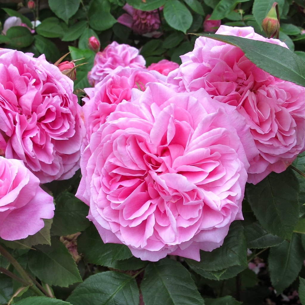 Королевский наряд этой розы — крупные, достигающие 10–12 см в диаметре, густомахровые цветки. В каждом бутоне насчитывается до 100 лепестков, создающих изысканную чашевидную форму. От тёмно-розовых бутонов до нежно-розовых раскрывшихся цветков — каждый этап их развития прекрасен по-своему.