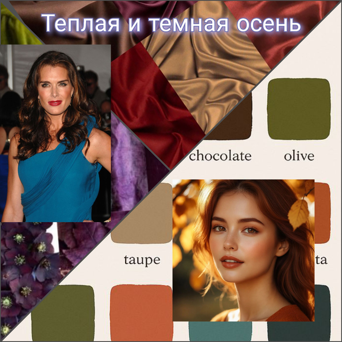 Разберем два оставшихся подтипа осеннего колорита. Обе осени характеризуются наличием жёлтой примеси, отвечающей за тепло, и серой, ответственной за мягкость. Однако, различие кроется в соотношении и количестве данных примесей в оттенках внешности. По названиям становится понятно у какой осени какая ведущая примесь или характеристика. У теплой больше всего теплоты или жёлтой примеси, у темной больше черной примеси или, правильнее даже, тёмно-серой. Соответственно теплая осень в первую очередь теплая, во-вторую, мягкая. От средне-светлой до средне-темной. Темная осень в первую очередь темная, а во-вторую теплая, а вот мягкость у данной осени плавающая характеристика: от средне-мягкой до средне-яркой. Что бы это понять давайте рассмотрим расположение данных колоритов относительно других. Особенность темной осени заключается в том, что она граничит с темной зимой не только с мягкой стороны, но и с яркой! В зависимости от степени выраженности второй и третье характеристик, выделяют 4