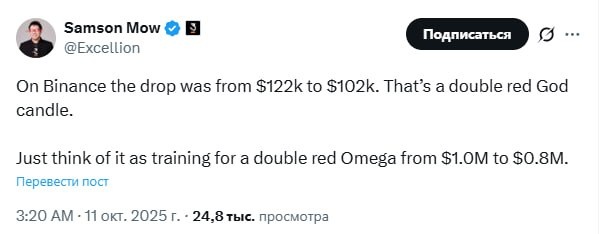 На Binance падение было с $122 тыс. до $102 тыс. Это двойная красная «свеча Бога» (God candle). Просто воспринимай это как тренировку перед двойной красной «Омега-свечой» с $1.0 млн до $0.8 млн.