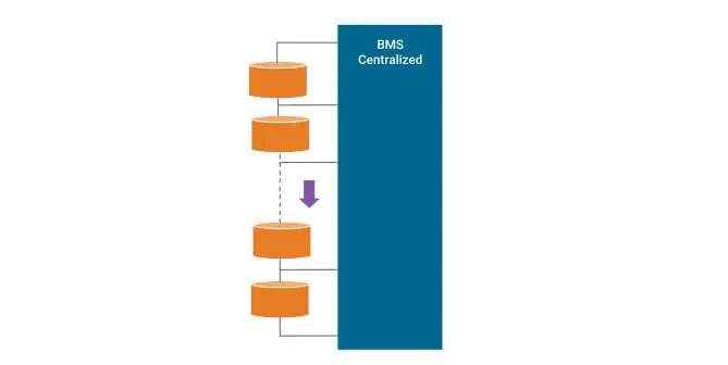 Суть централизованного проектирования BMS заключается в использовании одного контроллера для всех ячеек аккумуляторной батареи. Главный блок управления подключается непосредственно к каждой ячейке или модулю аккумуляторной батареи посредством специальных жгутов (проводов). Этот центральный блок выполняет функции контроля напряжения, измерения температуры, балансировки и защиты.