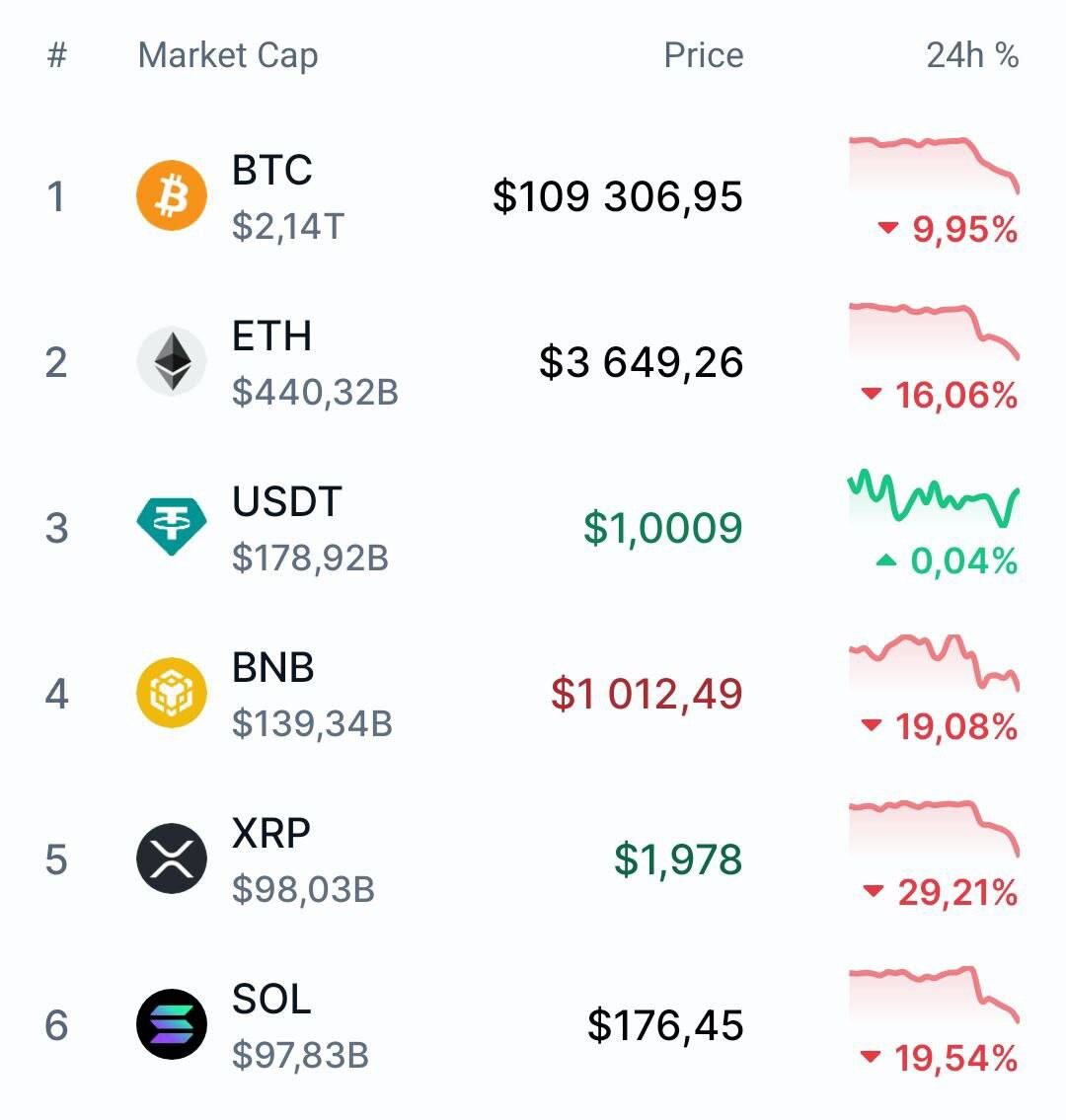 💰 Рынок накрыло: Bitcoin потерял 10%, альты обвалились на 20%-70.