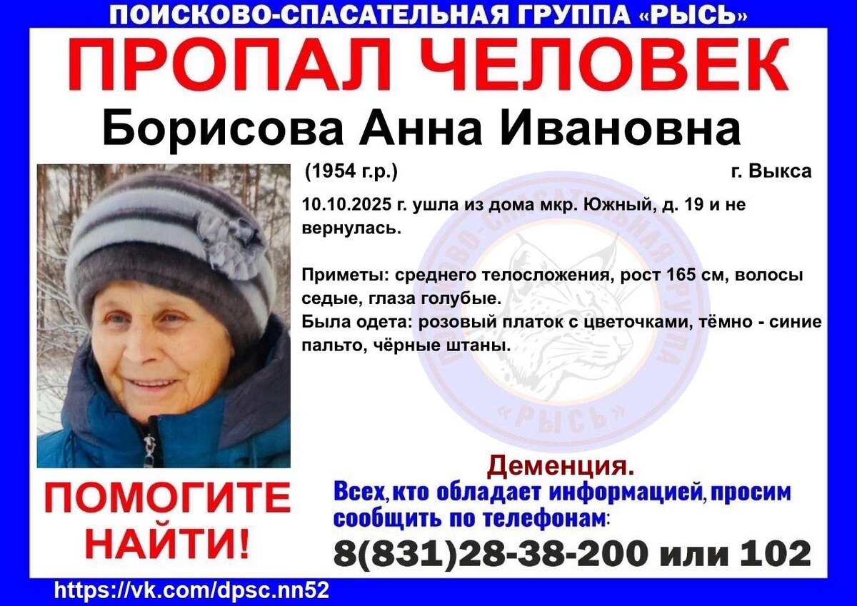 ❗️ СРОЧНЫЙ СБОР НА ПОИСК! УГРОЗА ЖИЗНИ! Дата сбора: 11.10.2025 г. Время сбора: 10:00 Место сбора: г. Выкса Точка сбора: мкр. Жуковского, д 2А (спорт-корпус) Борисова Анна Ивановна, 1954 г.р. 10.10.2025 г. ушла из дома мкр. Южный, д. 19 и не вернулась. ДЕМЕНЦИЯ. Инфорг: Ольга +7 (910) 135-56-28 ОЧЕНЬ НУЖНЫ ЛЮДИ, МАШИНЫ, КВАДРОЦИКЛЫ, КРОССОВЫЕ МОТОЦИКЛЫ, ПИТБАЙКИ. Форма одежды: лес (по погоде). С собой: фонарь, батарейки, горячий чай, вода, перекус. При добавлении в рабочую группу поиска, прошу сразу отписаться: https://vk.me/join//h6IEvJ9tDQL2eKCSfTPBANFkCSZeZdWzgM= (Кто готов - переходите по ссылки выше в рабочий чат и отписывайтесь там) 1. ФИО/ Позывной 2. Авто(кол-во свободных мест)/Пеший 3. Откуда выезжаете 4. Время выезда 5. РВП (расчетное время прибытия)после того, как экипаж выехал в полном составе.