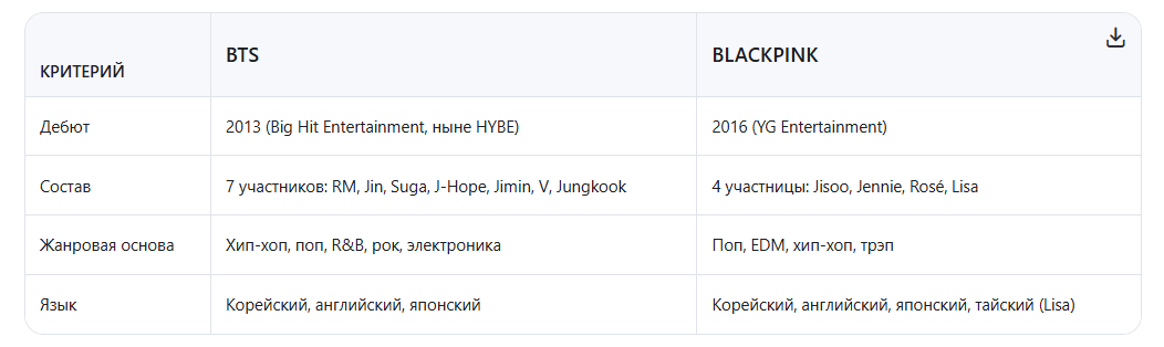 Ниже представлен подробный сравнительный анализ двух ведущих K-pop групп — BTS и BLACKPINK , — с акцентом на их музыкальные особенности, культурное влияние, социальную роль, коммерческий успех и восприятие аудиторией по состоянию на 2025 год. 1. Общая информация 2. Музыкальный стиль и эстетика BTS - Эволюция : начали с уличного хип-хопа → перешли к глобальному попу с элементами рока, джаза, латиносаунда. - Темы : ментальное здоровье, самоидентичность, юность, социальная критика, любовь. - Уникальность : участники пишут большинство текстов , участвуют в продюсировании (особенно RM, Suga, J-Hope). - Примеры : - «Spring Day» — метафора утраты и надежды. - «Permission to Dance» — гимн радости после пандемии. BLACKPINK - Эстетика : мощный, дерзкий, глянцевый звук — «girl crush». - Темы : уверенность, независимость, любовь с позиции силы, иногда критика поверхностности общества. - Уникальность : сильный акцент на визуал, хореографию и глобальный бренд . Тексты чаще создаются