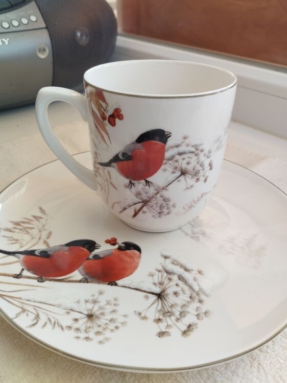 Так, чего-то меня в сторону занесло. Двоюродная подарила мне бокал со снегирями. Вот он, без тарелки только