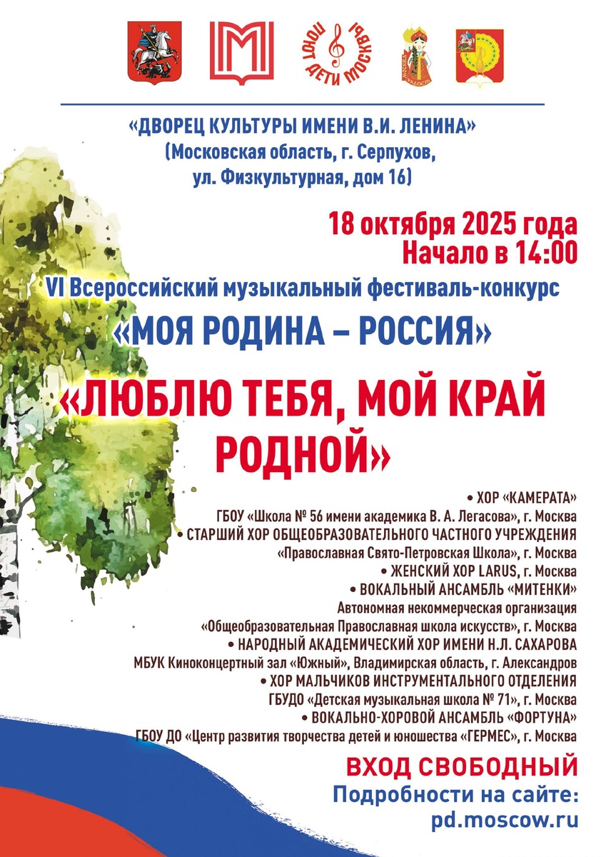 ✨ VI Всероссийский музыкальный фестиваль-конкурс «МОЯ РОДИНА - РОССИЯ» «ЛЮБЛЮ ТЕБЯ, МОЙ КРАЙ РОДНОЙ» Приглашаем вас на яркое музыкальное событие, которое состоится 18 октября в концертном зале Дворца культуры имени В.И. Ленина🌟 Это будет необыкновенно. Приглашаем Вас на фестиваль 🔥 🚫 Возраст: 0+ 📆 18.10.2025 🕒 14:00 🏢 ДК им. В.И. Ленина 📍 г. Серпухов, ул. Физкультурая, д.16 💰 Вход свободный❗️ ⭐Поддержать канал голосом 💰 Вакансия - курьер в Серпухове ✅ Мероприятия Серпухов https://dzen.ru/id/66f01c6eb4c6fe60c9ca1608 http://vk.com/serpukhov_events http://dzen.ru/serpukhov_events