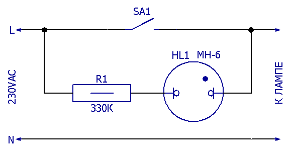 Распространённые выключатели освещения с индикаторами, предназначенные для облегчения его поиска в темноте, сделаны либо на неоновой лампе по схеме как на рисунке ниже: