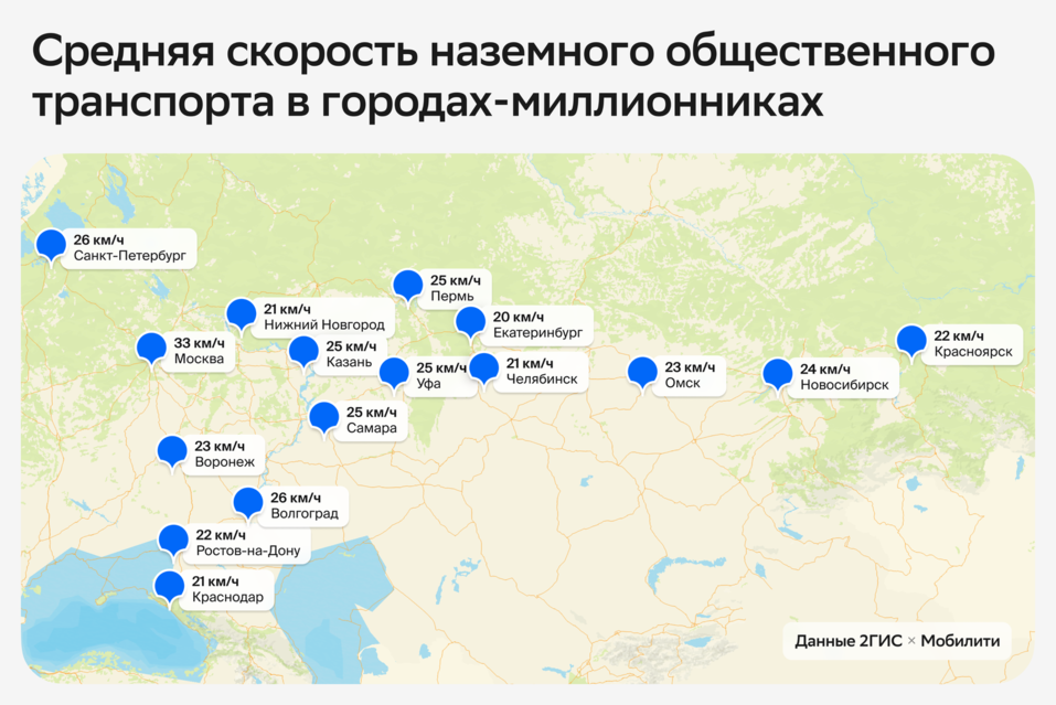 В Нижнем Новгороде средняя скорость движения наземного общественного транспорта составляет 21 км/ч. Это один из самых низких показателей среди крупных городов РФ, говорится в исследовании 2ГИС. Также медленно движется общественный транспорт в Екатеринбурге (20 км/ч), Челябинске, и Краснодаре (по 21 км/ч). Общественный транспорт с учетом всех остановок, пробок и пересадок едет медленно. Его реальная скорость во многих городах-миллионниках сопоставима с самокатами и велосипедами, — говорится в сообщении. Самая высокая средняя скорость движения наземного общественного транспорта среди мегаполисов страны — в Москве, 33 км/ч. Эксперты объясняют это наличием в столице выделенных полос для транспортных средств, а также специальной дорожной разметки. Следом за Москвой по величине показателя идут Санкт-Петербург и Волгоград (26 км/ч). NN.DK.RU писал ранее, что в 2025-2030 гг. Нижегородской области потребуется 12,6 млрд на закупку трамваев большого класса и автобусов. Сообщалось также, что ниже