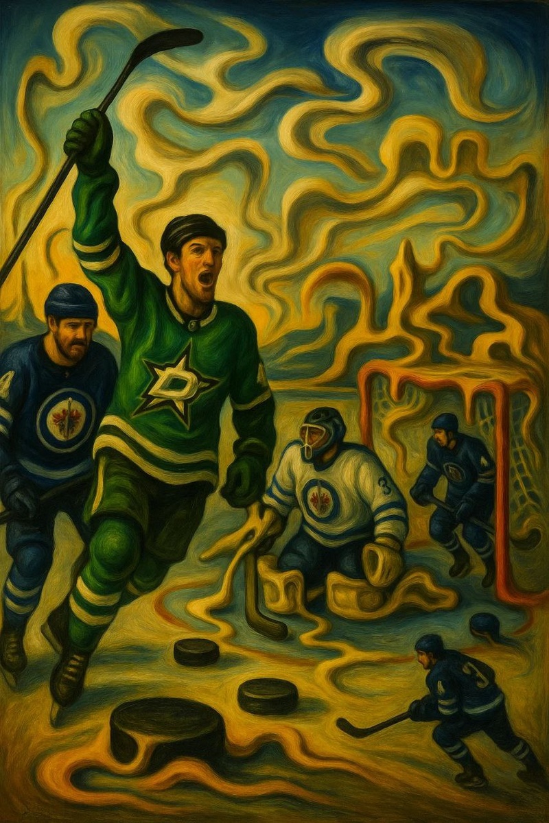 Забросив три шайбы в первом периоде Виннипег и Даллас взяли перерыв в забивании голов во втором отрезке матча. Но оторвались в третьей двадцатиминутке - шесть шайб совместными усилиями наколотили друг другу соперники. Старз вели в четыре гола к середине заключительного периода, но за семь минут Джетс накидали три шайбы и едва не свели безнадёжный было матч к ничейному исходу - 5:4 - "шерифы" превозмогли "воздушную армию". В стиле Дали