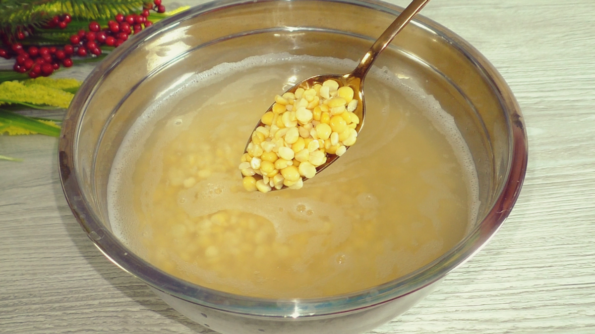 Горох хорошо моем и заливаем холодной водой минимум на 2 часа, но лучше дольше. Чем дольше вымачиваем, тем меньше времени потребуется на варку. Я вымачивала 6 часов.