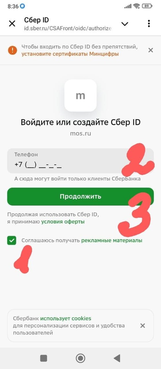 Далее действуем по номерам, сначала выставляем галочку о согласии, далее вводим номер своего телефона, и жмём продолжить