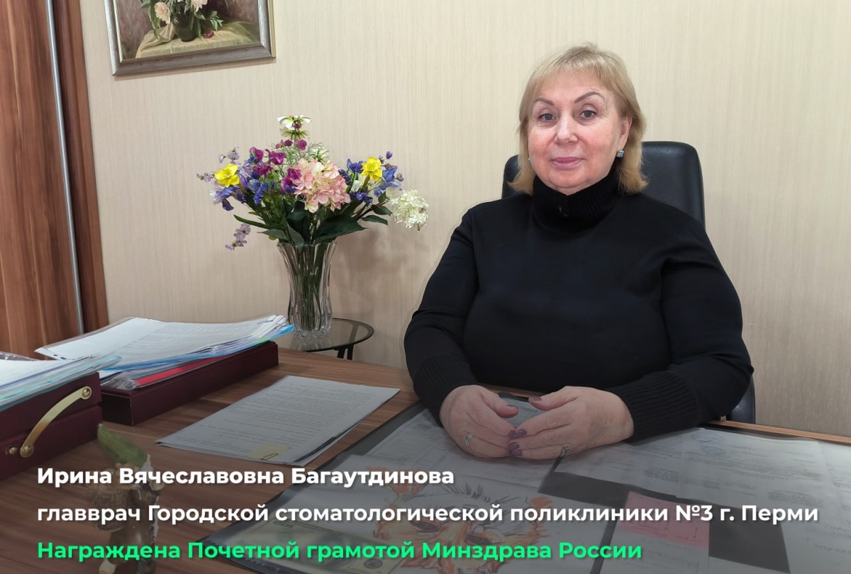 Почётной грамотой Министерства здравоохранения России отметили Ирину Багаутдинову. Её стаж в медицине — более 40 лет. За годы практики детским стоматологом Ирина Вячеславовна подарила здоровые улыбки десяткам тысяч юных пермяков. По её инициативе в школах Свердловского района были открыты современные стоматологические кабинеты. Сейчас она руководит Городской стоматологической поликлиникой № 3, продолжая вести приём.
