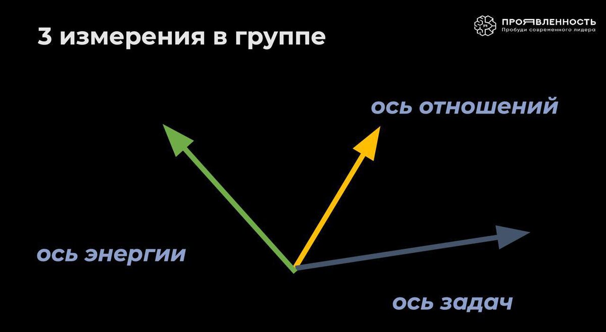 Три оси («энергии», «отношений», «задач») — это фактически три измерения, в которых живёт любая форум-группа