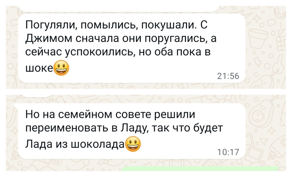 "Погуляли, помылись, покушали. С Джимом сначала они поругались, а сейчас успокоились, но оба пока в шоке😃"