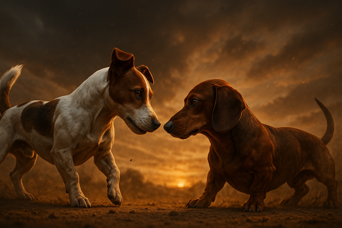 Битва охотников в миниатюре. Один — молния на лапах, другой — норный подрывник, рожденный для схваток в темноте. Две легенды, выведенные для погони и схватки с дичью, но действующие совершенно разными методами. Кто победит в этой схватке — скорость или настойчивость? ⚠️ Важное предупреждение Это теоретический разбор. Мы не поддерживаем и не оправдываем жестокое обращение с животными. Сравнение проводится исключительно ради понимания особенностей пород и их природных качеств. ————————————————————————————————————— 🐕🦺 Участники ринга 🎯Джек-рассел-терьер — Взрывной спринтер 🪖 Такса — Подземный боец ————————————————————————————————————— ⚙️ Сравнительный анализ 🧠 Назначение породы и психика Джек-рассел-терьер Назначение: Норный охотник, выведенный для работы в команде с лошадьми и гончими. Его задача — стремительный бросок, моментальный контакт с целью, мгновенная реакция. Тип агрессии: Реактивная, импульсная. Джек действует, как живая пружина. Он не думает долго — он взрывается, ко