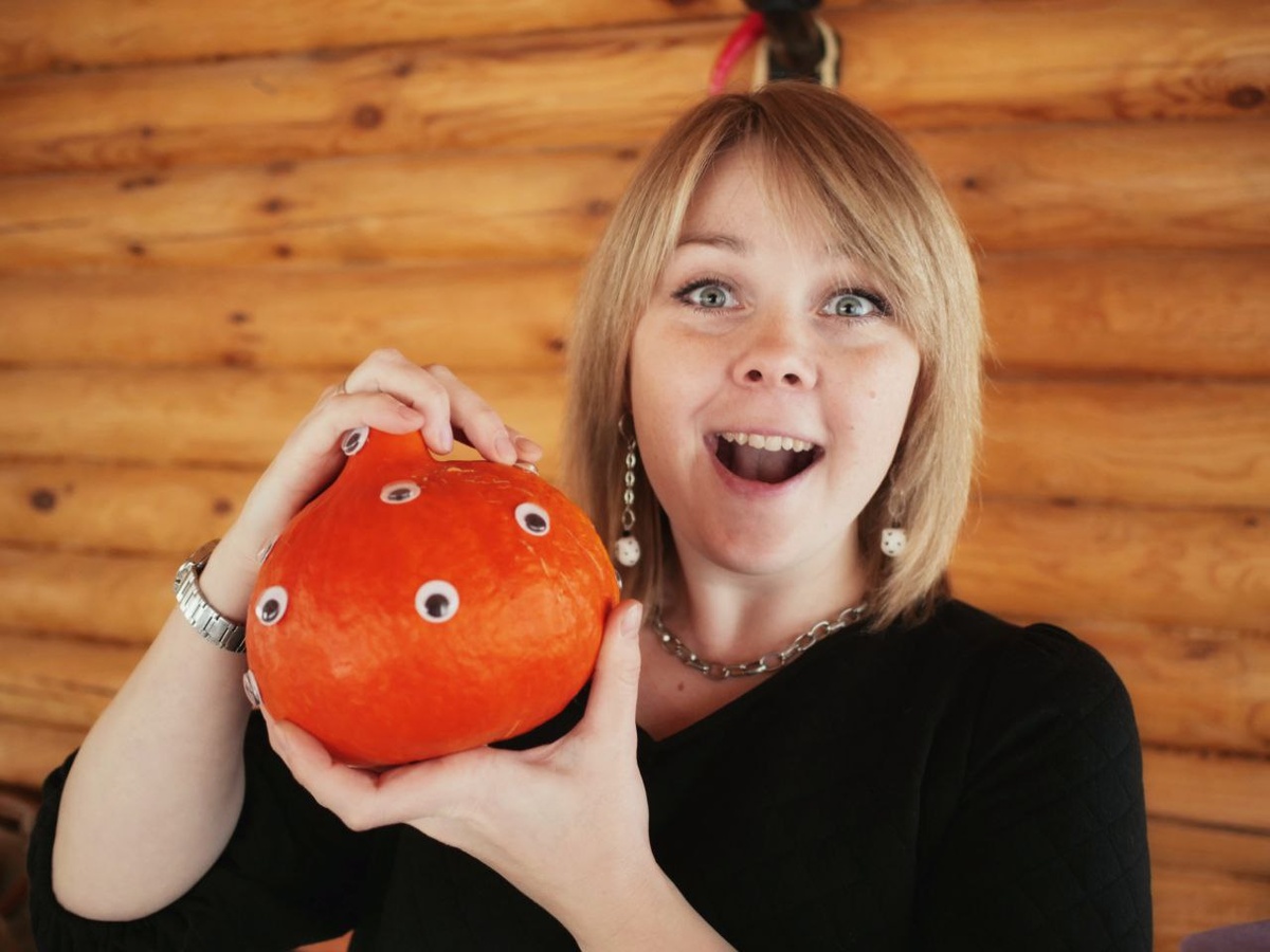 1. Наклеить на неё игрушечные глазки. 2. Сделать мордочку пластилином и украсить стразами. 3. Разрисовать акриловыми маркерами. 4. Высверлить дырки и вложить внутрь гирлянду. Традиционным способом мы тоже, конечно, вырезаем тыквенный фонарь. Но и вносим разнообразие в традицию, потому что отмечаем Хэллоуин много лет. Лайфхаки: сначала отрезаем верхнюю «шапочку», вычищаем ложкой семена, рисуем на тыкве фломастером будущую рожицу и вырезаем. Детям самим не справиться (тыква – жёсткий плод), у нас главный резчик – это папа. А вы вырезаете фонарь на 31 октября?