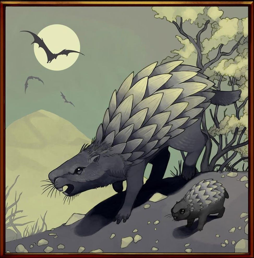 Степной спиногром Животное из проекта «Дикий мир будущего». Произошло от южноамериканского грызуна паки. Когда тропические леса Амазонки исчезли, уступив место лугам, эти грызуны больше не могли полагаться на укрытие джунглей для выживания и развили тяжёлую броню и шипы для защиты. Будучи очень успешным животным, быстро мигрировали в Северную Америку и приспособились к жизни в холодных и суровых условиях американской пустыни. Имеет крупное тело с перекрывающимися ороговевшими чешуйками, а также несколько шипов по бокам. Североамериканские и южноамериканские виды можно отличить по телосложению, форме чешуи и меховому покрытию. Южноамериканский вид имеет большую, толстую чешую (чтобы справиться с нападениями хищников, а также с пожарами) и шипы, которые помогают ему закапываться в земле). Североамериканский вид более стройный по форме и имеет менее широкие и тонкие чешуйки, так как в его ареале меньше хищников. Имеет густой мех, чтобы согреваться во время сильных холодов, и хвост, кот