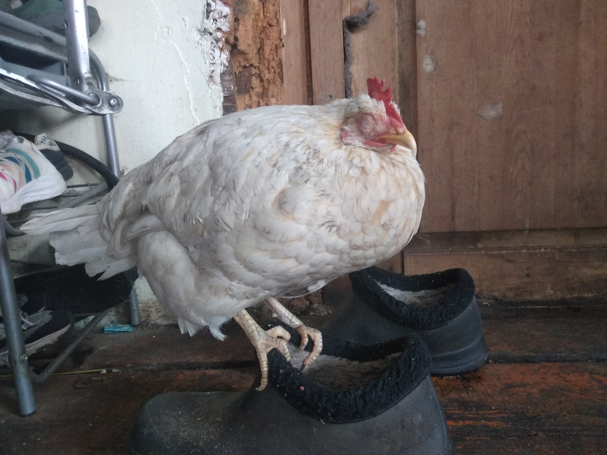 Тут я виновата: не доглядела за возрастной птицей, в итоге белая девочка, которая половину лета пыталась высидеть пустое гнездо и в итоге предельно ослабла, а потом получила несколько ударов в голову от молодого неопытного петушка и ослепла на один глаз - она перестала есть. И пить. Выпустила я курочек на снежок, а белая пернатая сидит посреди сугроба и не реагирует. Все бегут, она сидит. Глаза закрыла и нет реакции. Палку на нее положила - тот же ступор. Вытащила из сугроба и понесла домой. Курочка была легкая, как пушинка. Совсем высохла. Дома я за ней понаблюдала и сразу обнаружила, что беляночка ослепла практически на оба глаза. Пить не может, круто промахивается мимо емкостей с водой. Есть не может по той же причине. Подозреваю, что в мире она различает только большие пятна, которые далеко от нее. Реагировала птичка только на отварное мясо, это по запаху. Обклевала весь пол, пока попала клювом в кусочки мяса... В основном она спит. Спит. Спит. Не могу я ничем ей больше помочь, кроме как оставить уходить на радугу в тепле и в относительной безопасности. То есть дома.